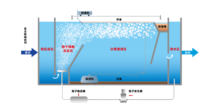 孢子轉(zhuǎn)移技術(shù),是將混凝技術(shù)、氣浮技術(shù)與微納米孢子相結(jié)合,通過定制化藥劑、微納米氣泡與水中的磷、疏水基懸浮物發(fā)生反應(yīng),創(chuàng)新形成的一種高效物理化學(xué)處理方法。主要解決了目前常用溶氣氣浮技術(shù)在應(yīng)用過程中存在的處理效率較差、表面負荷較低、處理能耗較高、應(yīng)急機動性不強等問題。